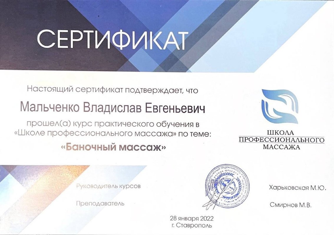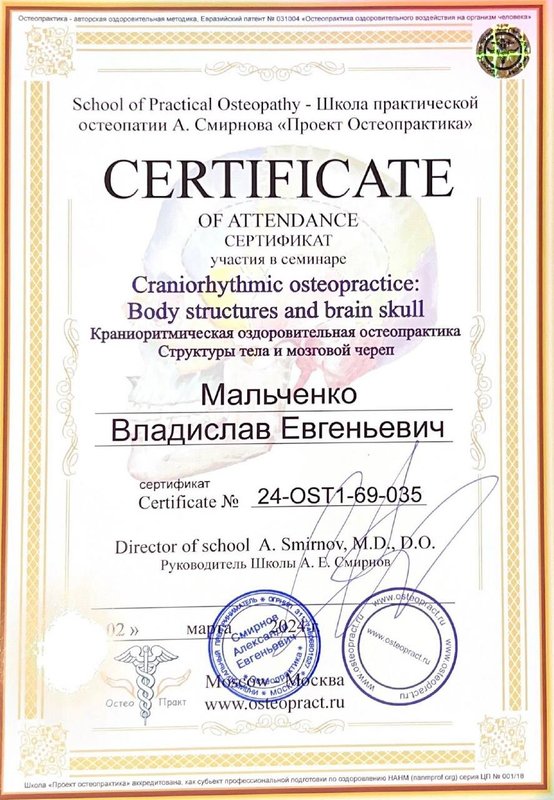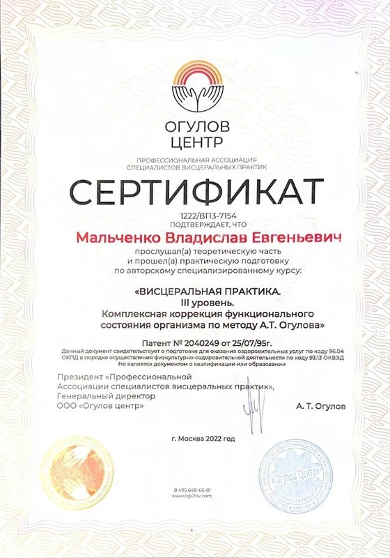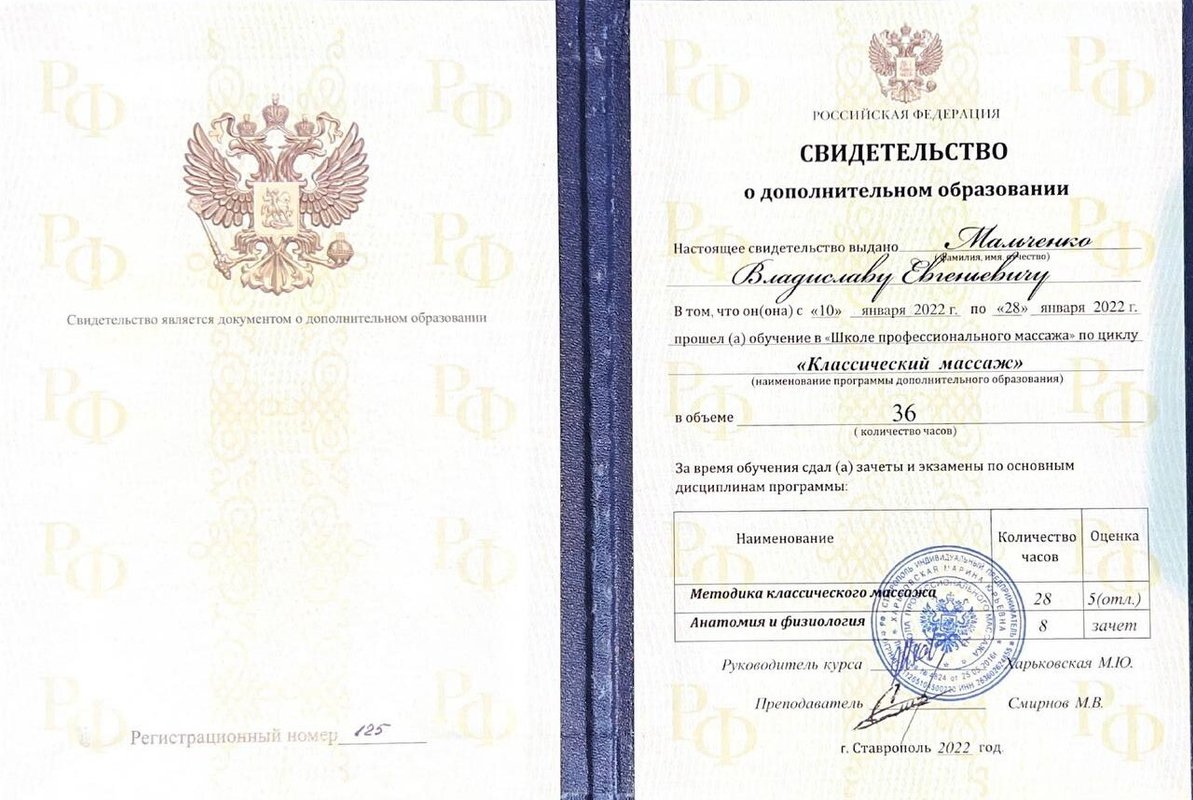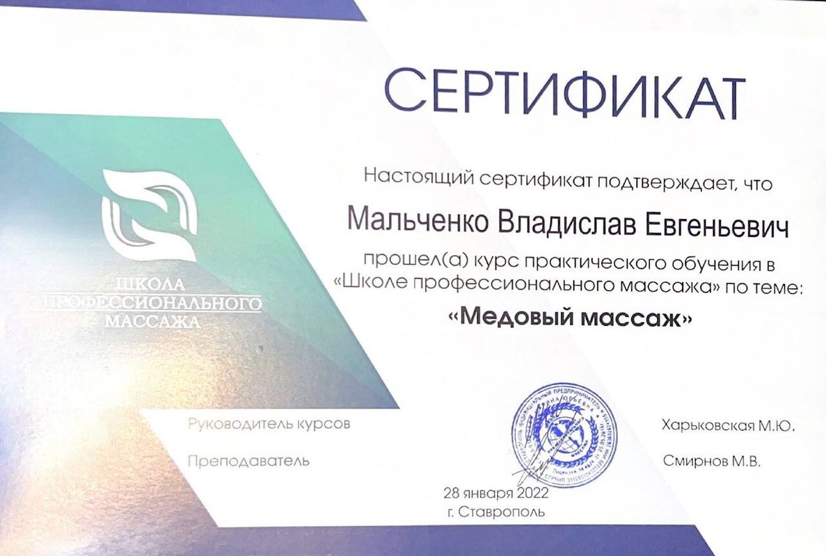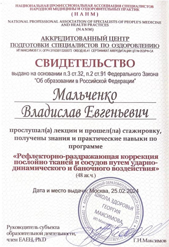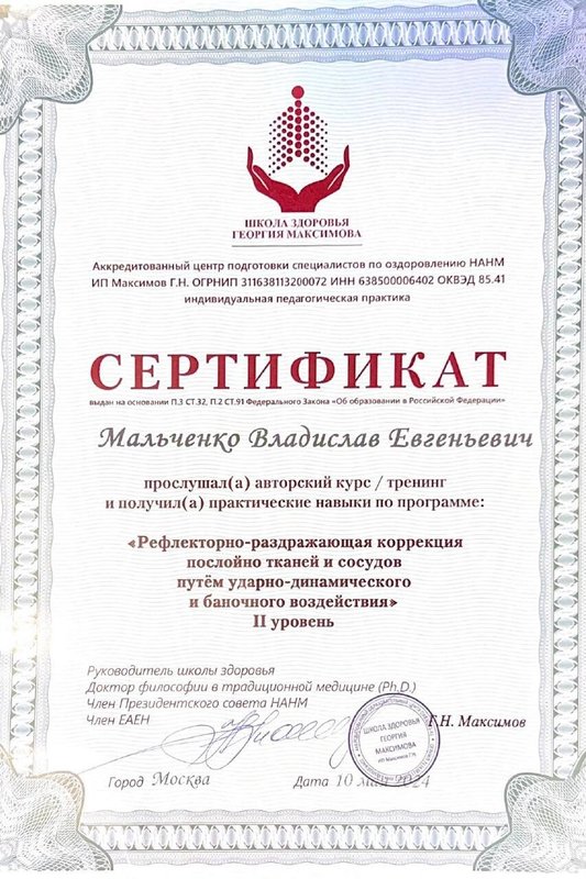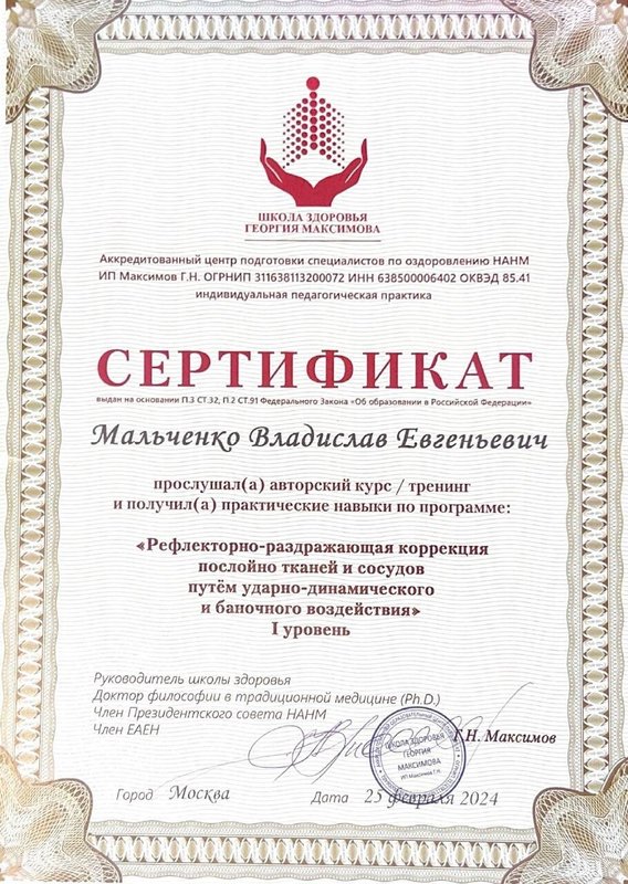 Ученик Владислава, работающий только по его методикам. Декабрь 2023 - Институт психосоматики А. Толоконина, сертификат "Ручные методы восстановления органов и тканей организма в психосоматике". Февраль 2024 - Огулов центр, сертификат "Остеопатические техники" 1 уровень. Апрель 2024 - Международный центр профессионального образования, диплом "Методики и техники оздоровительный массажа". Апрель 2024 - Международный центр профессионального образования, сертификат "Кинезиотейпирование" Апрель 2024 - Aravia Professional, сертификат "Французский скульптурный массаж лица". Май 2024 - Школа здоровья Георгия Максимова, сертификат "Рефлекторно-раздражающая коррекция послойно тканей и сосудов путем ударно-динамического и баночного воздействия" 1 уровень. Июнь 2024 - Огулов центр, сертификат "Висцеральная практика 1 уровень. Технологии комплексной коррекции функционального состояния организма по методу А. Огулова" Июнь 2024 - Огулов центр, сертификат "Практика висцерального массажа" Сентябрь 2024 - Институт современного образования, диплом "Специалист по адаптивной физической культуре и реабилитации" Октябрь 2024 - Академия самопознания В. Мальченко, семинар "Азбука здоровья"