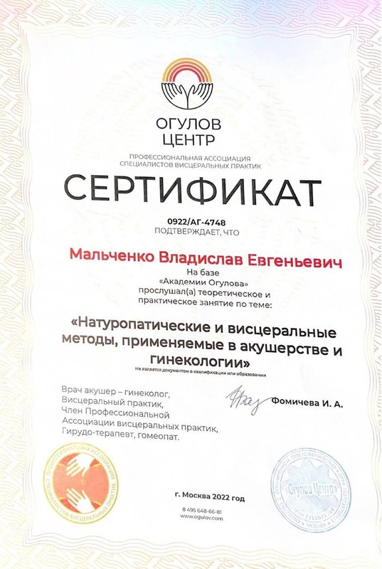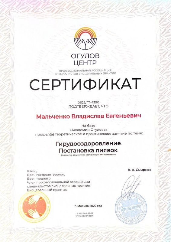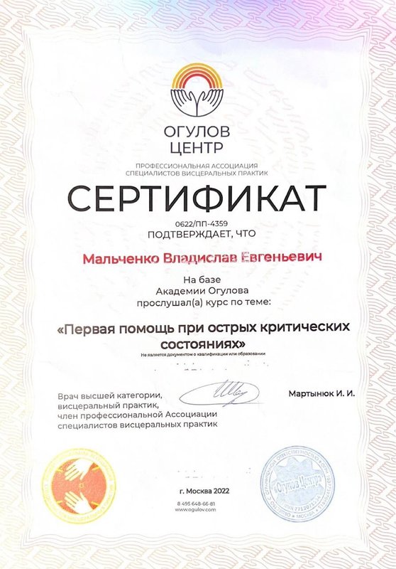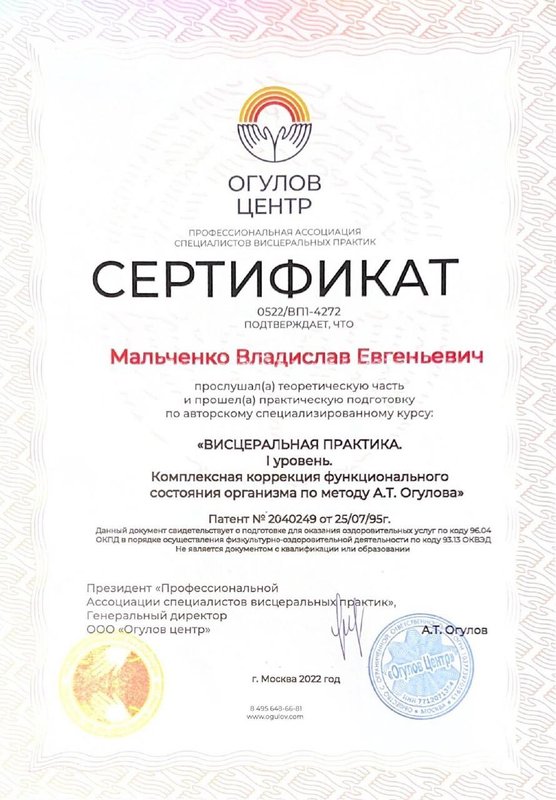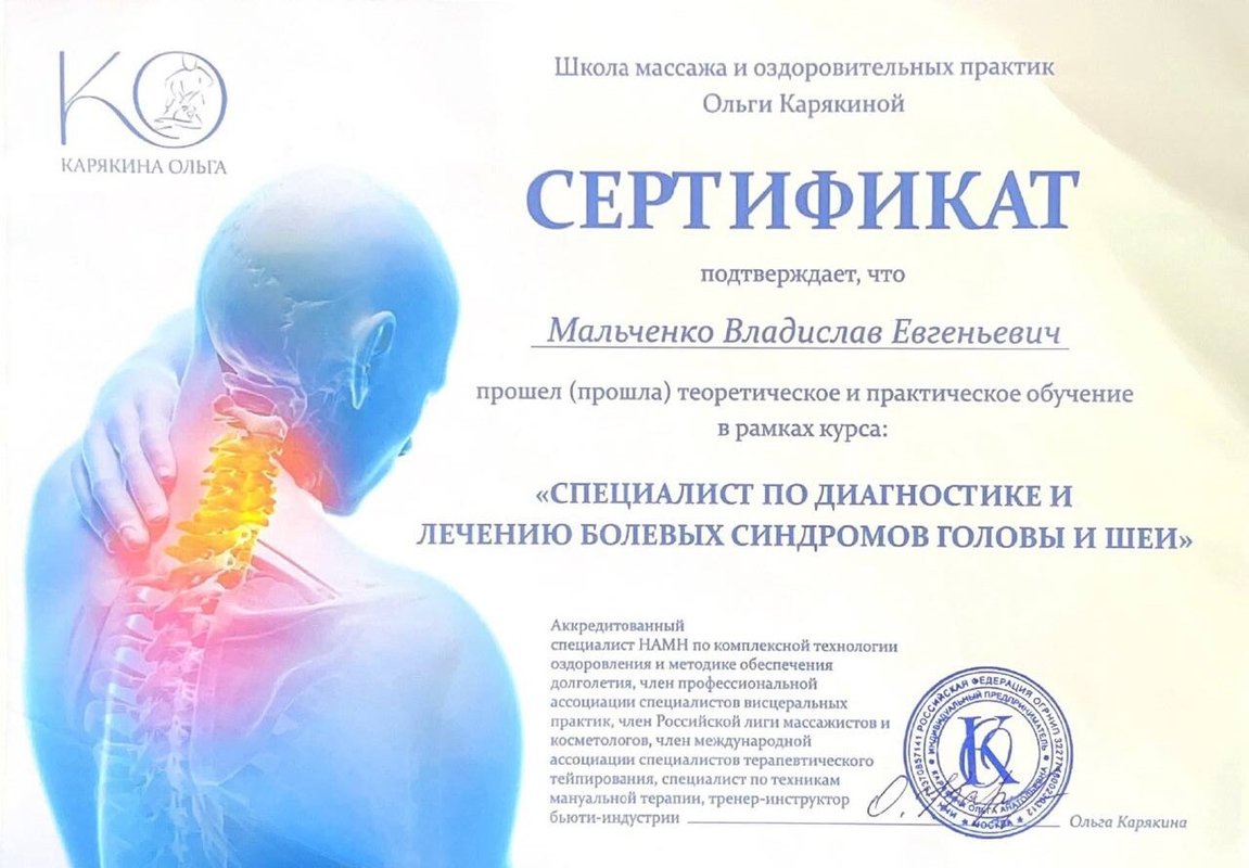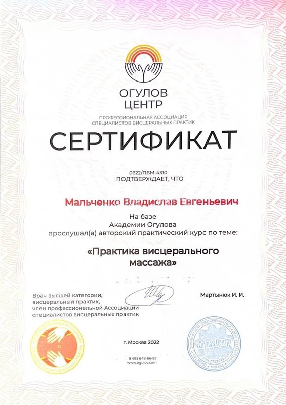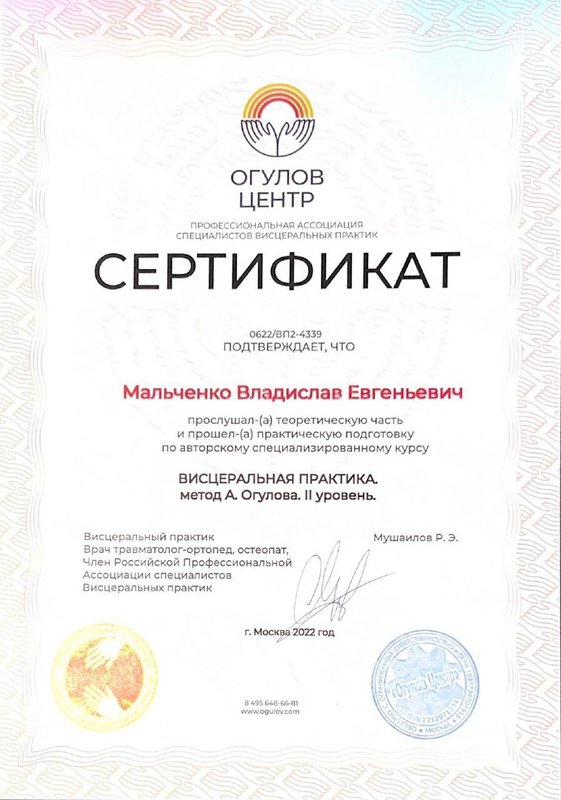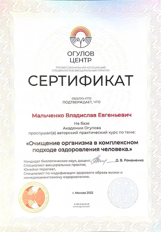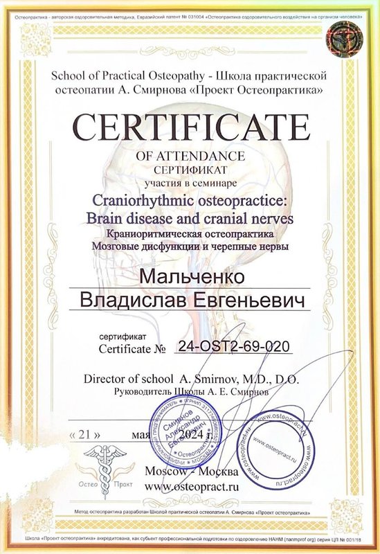 Ученик Владислава, работающий только по его методикам. Декабрь 2023 - Институт психосоматики А. Толоконина, сертификат "Ручные методы восстановления органов и тканей организма в психосоматике". Февраль 2024 - Огулов центр, сертификат "Остеопатические техники" 1 уровень. Апрель 2024 - Международный центр профессионального образования, диплом "Методики и техники оздоровительный массажа". Апрель 2024 - Международный центр профессионального образования, сертификат "Кинезиотейпирование" Апрель 2024 - Aravia Professional, сертификат "Французский скульптурный массаж лица". Май 2024 - Школа здоровья Георгия Максимова, сертификат "Рефлекторно-раздражающая коррекция послойно тканей и сосудов путем ударно-динамического и баночного воздействия" 1 уровень. Июнь 2024 - Огулов центр, сертификат "Висцеральная практика 1 уровень. Технологии комплексной коррекции функционального состояния организма по методу А. Огулова" Июнь 2024 - Огулов центр, сертификат "Практика висцерального массажа" Сентябрь 2024 - Институт современного образования, диплом "Специалист по адаптивной физической культуре и реабилитации" Октябрь 2024 - Академия самопознания В. Мальченко, семинар "Азбука здоровья"